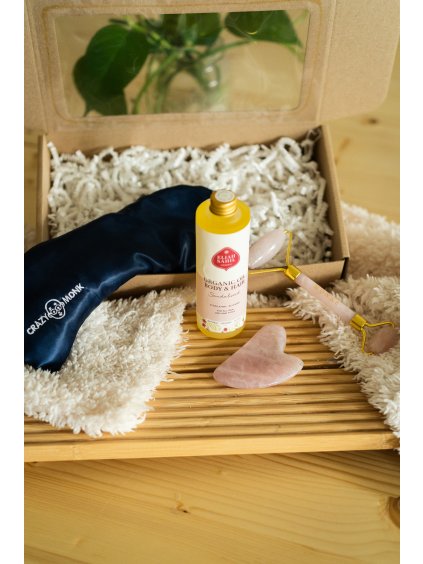 Sada obsahuje Gua Sha a Face Roller z pravého Ruženínu, určené na lifting a prekrvenie pleti, vyživujúci olej Eliah Sahil a zamatový vankúšik s ľanovými semiačkami na relaxáciu...